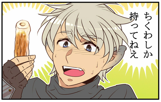 野生のオッサンがはしゃぎながら去る際のエギュ君&アキトの様子も描きたかったのですが、ちくわのインパクトが強すぎてこうなってしまったとさ(昔話風)